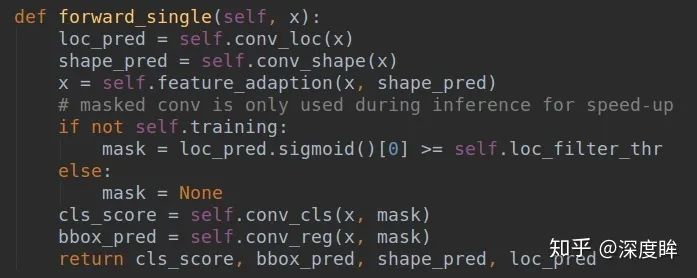 关于feature_adaption的作用作者在论文分享中:Guided Anchoring: 物体检测器也能自己学 Anchor(https://zhuanlan.zhihu.com/p/55854246)说的很清楚了,我就不写了。反正forward后就可以4个分支输出。