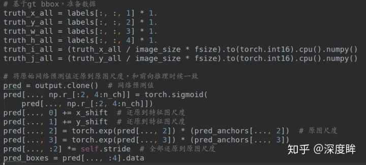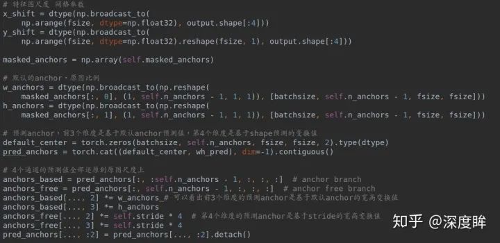 ,s是每个特征图的stride,w就是原始gt bbox宽,dw才是shape分支的预测值。上述的squares_list存储的就是每层特征图的每个位置的基数,用于还原shape预测值到真实比例,由于anchor=1,且对于任意层而言是固定的,所以在代码实现上作者也用了anchor_generate代码来实现