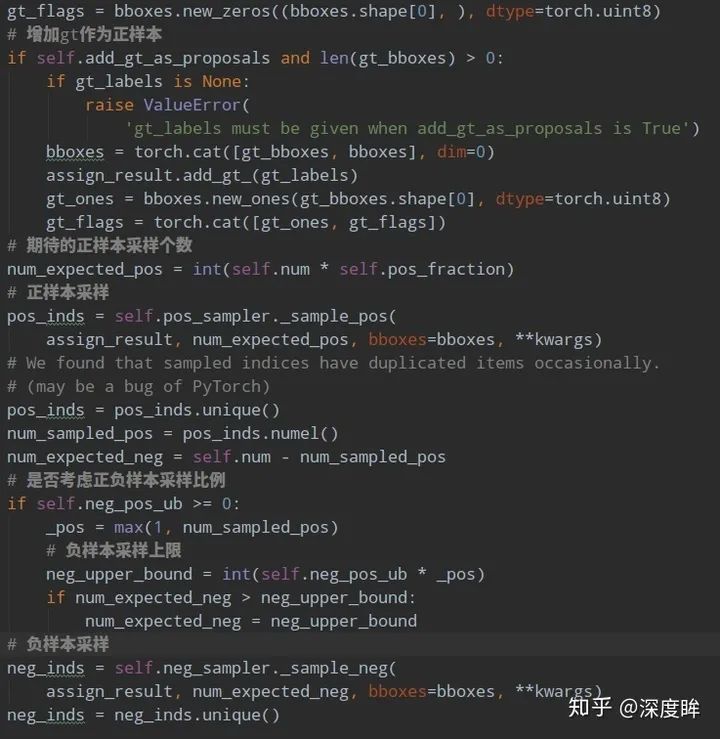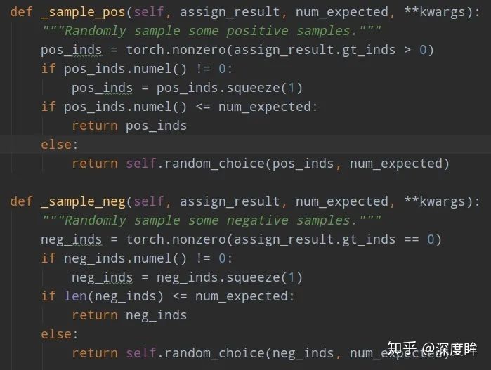 步骤2可以区分正负和忽略样本,但是依然存在大量的正负样本不平衡问题,解决办法可以通过正负样本采样或者loss上面一定程度解决,faster rcnn默认是需要进行正负样本采样的。rpn head和rcnn head的采样器都比较简单,就是随机采样,阈值不一样而已。rpn head采样器: