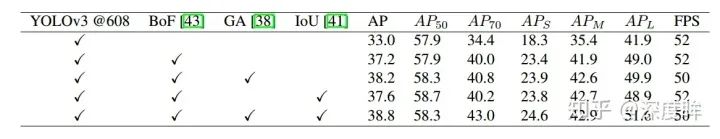 首先采用基于Bag of freebies for training object detection neural networks里面提出的训练策略来改进性能,主要包括 the mixup algorithm , the cosinelearning rate schedule和 the synchronized batch normalization。 其次,由于最新论文表示iou loss对于边界框回归效果好,故作者也额外引入了一个iou loss来优化bbox。最后,由于GA论文(Region proposal by guided anchoring)指出采用语义向导式的anchor策略可以得到更好的结果,故作者也引入了GA操作来提升性能。可以看出,结合这些策略后,在coco上面可以得到38.8的mAP,速度仅仅慢了一点点(多了GA操作),可谓是非常强大,这也反应出训练策略对最终性能的影响非常大。