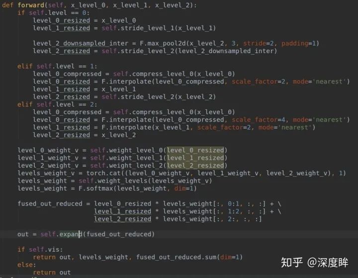 简要思想就是:原来的FPN add方式现在变成了add基础上多了一个可学习系数,该参数是自动学习的,可以实现自适应融合效果,类似于全连接参数。ASFF具体操作包括 identically rescaling和adaptively fusing。定义FPN层级为l,为了进行融合,对于不同层级的特征都要进行上采样或者下采样操作,用于得到同等空间大小的特征图,上采样操作是1x1卷积进行通道压缩,然后双线性插值得到;下采样操作是对于1/2特征图是采样3 × 3 convolution layer with a stride of 2,对于1/4特征图是add a 2-stride max pooling layer然后引用stride 卷积。Adaptive Fusion