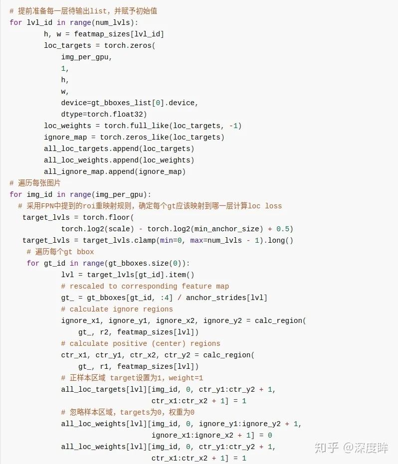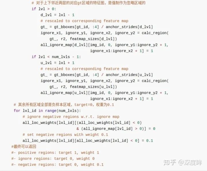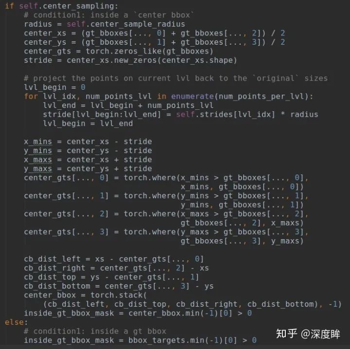 如果需要进行中心采样,那么基于采样半径比例×当前stride的范围内都属于正样本inside_gt_bbox_mask,其余样本全部属于负样本。可能很多人都有疑问:为啥不需要设置忽略区域?个人猜测原因可能是:1. 设置忽略区域,又需要增加一个超参;2.多了一个center-ness分支,可以很大程度抑制这部分区域对梯度的影响。3.间接的增加了正样本数目。不管咋说应该是作者实验后发现没有很大必要吧。