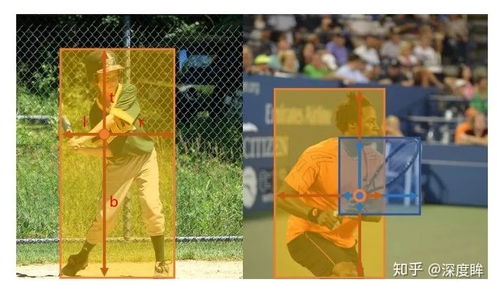 每个点回归的4个数代表距离4条边的距离,非常简单易懂。和所有目标检测算法一样,需要提前定义好正负样本,同时由于是多尺度预测输出,还需要首先考虑gt由哪一个输出层具体负责。作者首先设计了min_size和max_size来确定某个gt到底由哪一层负责,具体设置是0, 64, 128, 256, 512和无穷大,也就是说对于第1个输出预测层而言,其stride=8,负责最小尺度的物体,对于第1层上面的任何一个空间位置点,如果有gt bbox映射到特征图上,满足0 < max(中心点到4条边的距离) < 64,那么该gt bbox就属于第1层负责,其余层也是采用类似原则。总结来说就是第1层负责预测尺度在0~64范围内的gt,第2层负责预测尺度在64~128范围内的gt,其余类推。通过该分配策略就可以将不同大小的gt分配到最合适的预测层进行学习。
