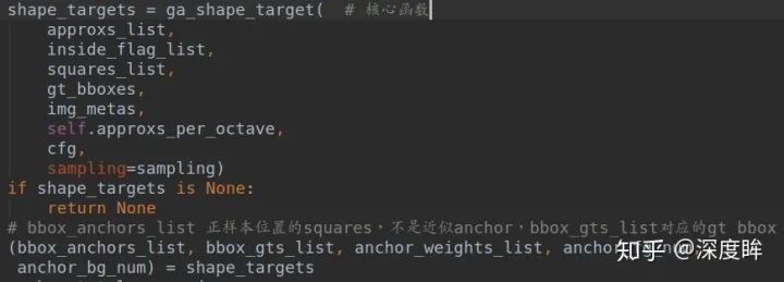 函数内部实现是一样的,但是由于传入的参数不一样,所有解释就不一样了。第一行的输入是anchor和gt bbox,意思是随机采样正负样本,并且同时将gt bbox作为label,后面直接计算回归loss,但是注意ga分支的输入是assign_result和squares,而不是assign_result和gt bbox,也不是assign_result和approxs。也就是说咱们暂时把每个正样本位置shape预测值的target认为是squares值,后面还会进一步操作。