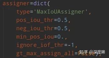 其定义anchor与gt的iou小于0.5的就全部认为是负样本,大于0.5的最大iou样本认为是正样本anchor,同时由于min_pos_iou=0以及gt_max_assign_all=False,可以发现该设置的结果是每个gt可能和多个anchor匹配上,匹配阈值比较低,且每个gt一定会和某个anchor匹配上,不可能存在gt没有anchor匹配的情况,且没有忽略样本。总结下意思就是: