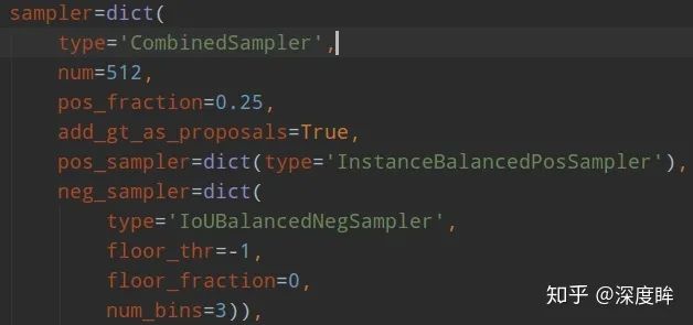 注意libra rcnn的正负样本采样规则修改仅仅是对于rcnn而言,对于rpn head没有任何修改,依然是随机采样器。原因是作者的主要目的是为了涨点mAP,作者认为rpn涨几个点对最终bbox 预测map没有多大帮助,因为主要是靠rcnn部分进行回归预测才能得到比较好的mAP。其参数如下: