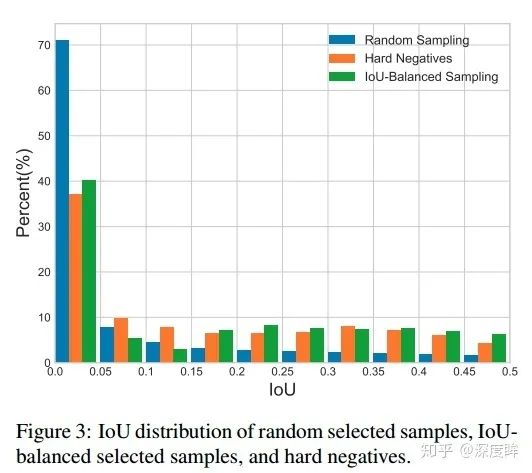 主要看IoUBalancedNegSampler部分即可。仅仅作用于负样本(iou=0~0.5之间)。作者认为样本级别的随机采样会带来样本不平衡,由于负样本本身iou的不平衡,当采用随机采样后,会出现难负(iou 0.5附近)和易负(iou接近0)样本不平衡采样,导致后面性能不好。作者发现了如果是随机采样的话,随机采样到的样本超过70%都是在IoU在0到0.05之间的,都是易学习负样本,作者觉得是不科学的,而实际统计得到的事实是60%的hard negative都落在IoU大于0.05的地方,但是随机采样只提供了30%,实在是太少了。最常用的解决难易样本不平衡问题的解决办法就是ohem,基于Loss排序来采样难负样本,但是作者分析,(1) 这种方法对噪音数据会比较敏感,因为错误样本loss高;(2) 参数比较难调。所以作者提出了IoU-balanced Sampling,如下所示: