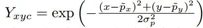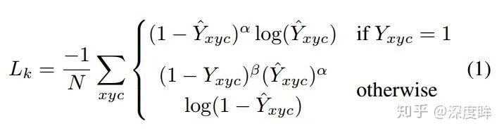 Y是label,0或者1,当Y=1时候,也就是正样本位置,就是标准的focal loss设定;其余区域,分为附近区域和外围区域,附近的定义采用了自适应宽高标准差的做法,在2d高斯分布内部的属于附近区域,外面的都称为外围背景区域,外围区域也是标准的focal loss定义。故作者设计更改的就是附近区域,也就是 ,可以发现如果去掉 ,就是标准的focal loss。附近区域中越靠近中心点的惩罚Y越大,Loss权重 越小,表示该位置对于正还是负的区分越模糊。