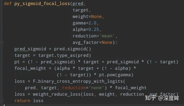 上面的公式表示label必须是one-hot形式。只看图示就很好理解了,对于任何一个类别的样本,本质上是希望学习的概率为1,当预测输出接近1时候,该样本loss权重是很低的,当预测的结果越接近0,该样本loss权重就越高。而且相比于原始的CE,这种差距会进一步拉开。由于大量样本都是属于well-classified examples,故这部分样本的loss全部都需要往下拉。其简单思想版本如下: