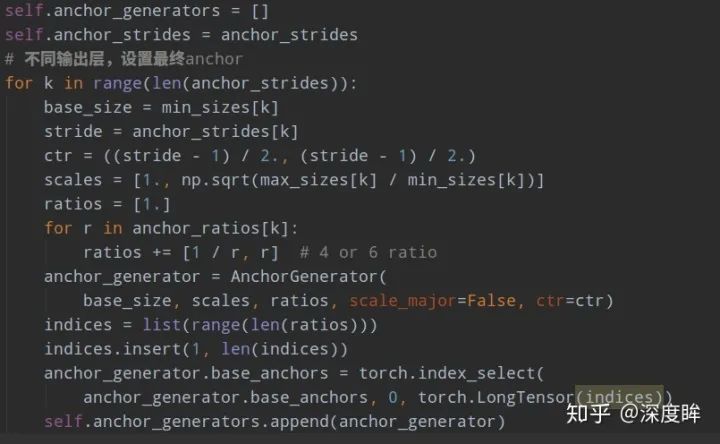 可以看出,ssd一共包括6个尺度输出,每个尺度的strides可以从anchor_strides中看出来,basesize_ratio_range表示正方形anchor的min_size和max_size,anchor_ratios表示每个预测层的anchor个数,以及比例。有点绕,下面具体分析。为了方便设置anchor,作者设计了一个公式来生成anchor,具体为: