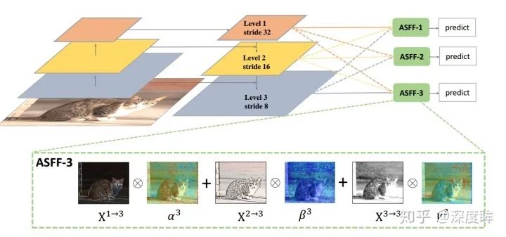 本文先分析不那么重要的部分,即本文最大改进ASFF(Adaptively Spatial Feature Fusion)操作,其实熟悉BiFpn的人应该马上就能get到idea了,我觉得本质上没有啥区别。FPN操作是一个非常常用的用于对付大小尺寸物体检测的办法,作者指出FPN的缺点是不同尺度之间存在语义gap,举例来说基于iou准则,某个gt bbox只会分配到某一个特定层,而其余层级对应区域会认为是背景(但是其余层学习出来的语义特征其实也是连续相似的,并不是完全不能用的),如果图像中包含大小对象,则不同级别的特征之间的冲突往往会占据要素金字塔的主要部分,这种不一致会干扰训练期间的梯度计算,并降低特征金字塔的有效性。