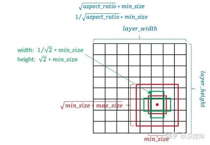 计算得到min_size和max_size后,需要再使用宽高比例因子来生成更多比例的anchor,一般选取 ,但是对于比例为1的先验框,作者又单独多设置了一种比例为1, 的尺度,所以一共是6种尺度。但是在实现时,Conv4_3,Conv8_2和Conv9_2层仅使用4个先验框,它们不使用长宽比为3,1/3的先验框,每个单元的先验框的中心点分布在各个单元的中心。具体细节如下: