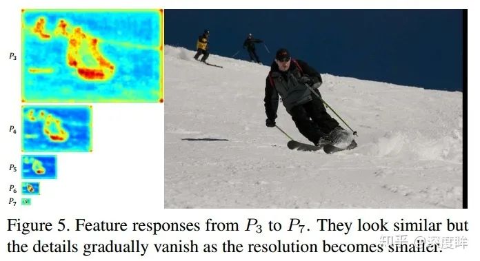 图(d)即为retinanet的网络结构。主要特点是:(1) 多尺度预测输出;(2) 采用FPN结构进行多层特征图融合。网络进行多尺度预测,尺度一共是5个,每个尺度共享同一个head结构,但是分类和回归分支是不共享权重的。