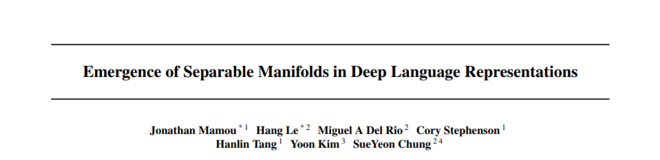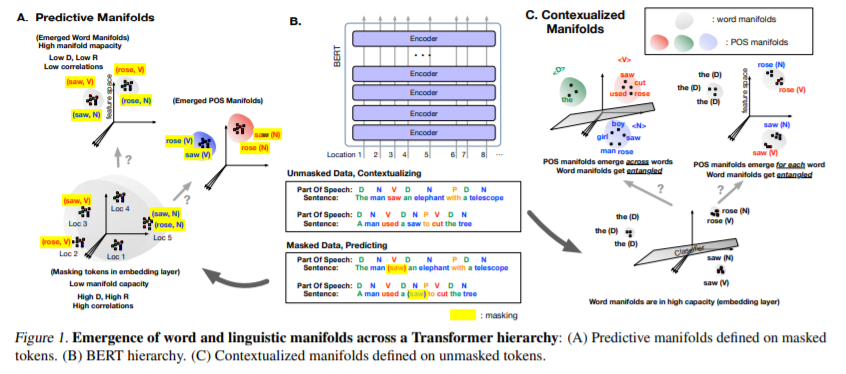 人工神经网络(ANNS)在解决各种认知模式下的感知任务方面显示出很大的经验成功。虽然它们只是受到生物大脑的松散启发,但最近的研究报告称,从任务优化的神经网络中提取的表征与大脑中的神经种群之间存在相当多的相似性。神经网络后来成为一个流行的模型类,用来推断复杂认知功能下的计算原理,反过来,它们也成为一个自然的实验平台,用来应用最初开发的方法来探测神经群体中的信息。在这项工作中,我们利用平均场理论流形分析,从计算神经科学的最新技术,从大规模语境嵌入模型分析语言表示的高维几何。我们从不同的模型族(BERT, RoBERTa, GPT-2等)中探索表征,并找到跨层深度的语言流形出现的证据(例如词性流形和组合范畴语法标签)。我们进一步观察到,不同的编码方案用于获取表示,导致这些语言流形出现在网络的早期或后期层的差异。此外,我们发现这些流形中线性可分性的出现是由流形半径、维数和流形间相关性的联合减少所驱动的。