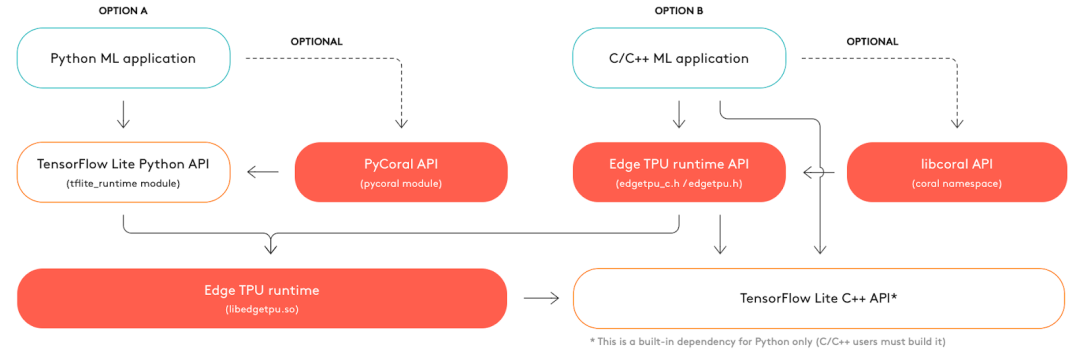 支持 TensorFlow Lite 运行的硬件包括 CPU、 GPU、 DSP 等,Google 自主研发的硬件解决方案为 Edge TPU 和 Coral,它们采用同样的芯片。