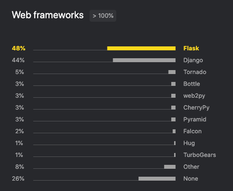 在 Web 框架方面,显然 Flask 和 Django 最受欢迎,两者以 48%、44% 的占比遥遥领先其他框架。
