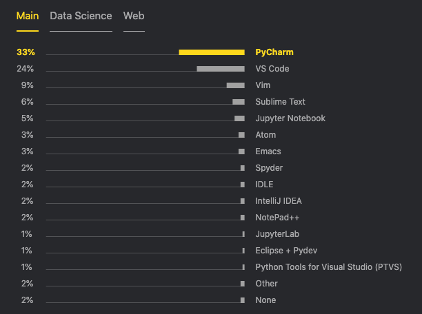 而在编辑器及 IDE 方面,尽管 VS Code 在所有开发者中深受欢迎,不过在 Python 的世界里,它还是要让位给 PyCharm,其以 33% 的占比位列第一。但 PyCharm 还是有着非常强的危机感,毕竟 VS Code 的增长速度极快,它已经从 2017 年的 7%,快速上升到了 24%。