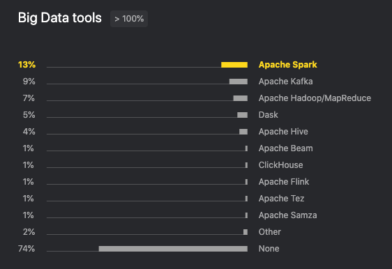 在大数据方面,Apache Spark 以 13% 的占比位列第一。