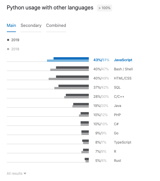 同时,开发者们在使用 Python 的同时,其他还会使用哪些编程语言?数据显示,JavaScript 依然高居榜首。不过值得注意的是, 有越来越多的开发者表示,除了 Python 之外,没有再使用其他语言,这个占比已经从去年的 6% 提升到了 11%。