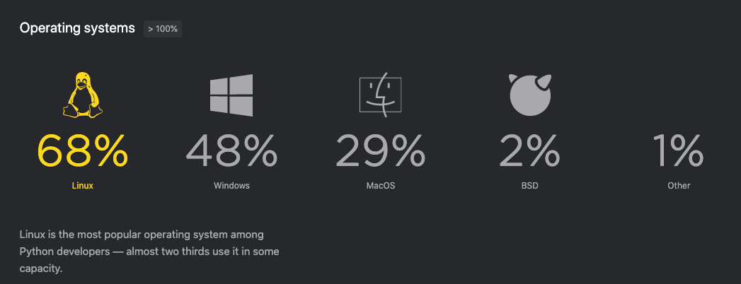 值得一提的还有操作系统方面,Linux 是 Python 开发者最喜爱的操作系统,几乎三分之二的开发者都在使用它,其次是 Windows。