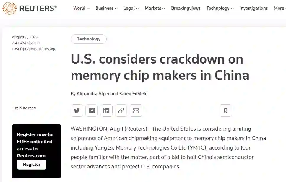 据路透社报道,美国正考虑限制向中国存储芯片制造商出口美国芯片制造设备,其中包括长江存储。据出口管制专家称,这一举措标志着美国首次通过出口管制,来针对中国生产没有专门军事用途的存储芯片。
