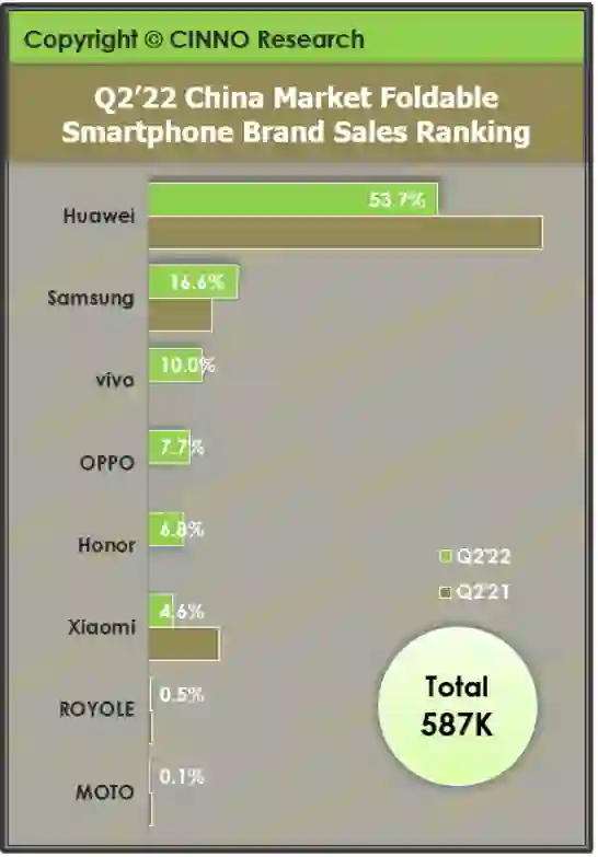 近日,CINNO Research 公布的最新报告显示,2022 上半年中国折叠手机销量超 2021 年全年,华为折叠屏销量在第二季度登顶。数据显示,2022 年第二季度中国市场折叠屏手机销量达 58.7 万部,同比大增 132.4%,上半年累计销量达 130 万部,超过 2021 年全年的 116 万部成绩。