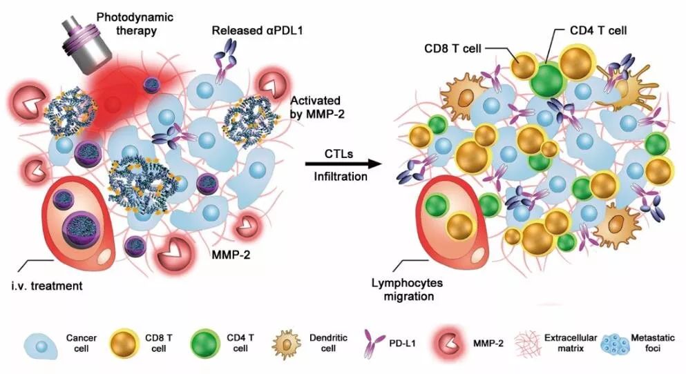 中国科学院上海药物研究所研究员于海军和李亚平合作开发了肿瘤微环境激活型免疫检查点抗体药物递送系统。这种抗体药物递送系统通过整合anti-PD-L1抗体(αPDL1)和吲哚菁绿(ICG)形成粒径约为150 nm的纳米颗粒。ICG已经取得临床获批可用于活体手术荧光成像。抗体纳米颗粒可在血液中稳定循环,同时避免αPDL1与正常组织PD-L1结合,一旦在肿瘤部位累积便被激活以释放αPDL1,用于肿瘤特异性PD-L1阻断。