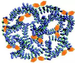 携带PD-L1抗体(蓝色)和光敏剂(绿色)的活化纳米颗粒的图示