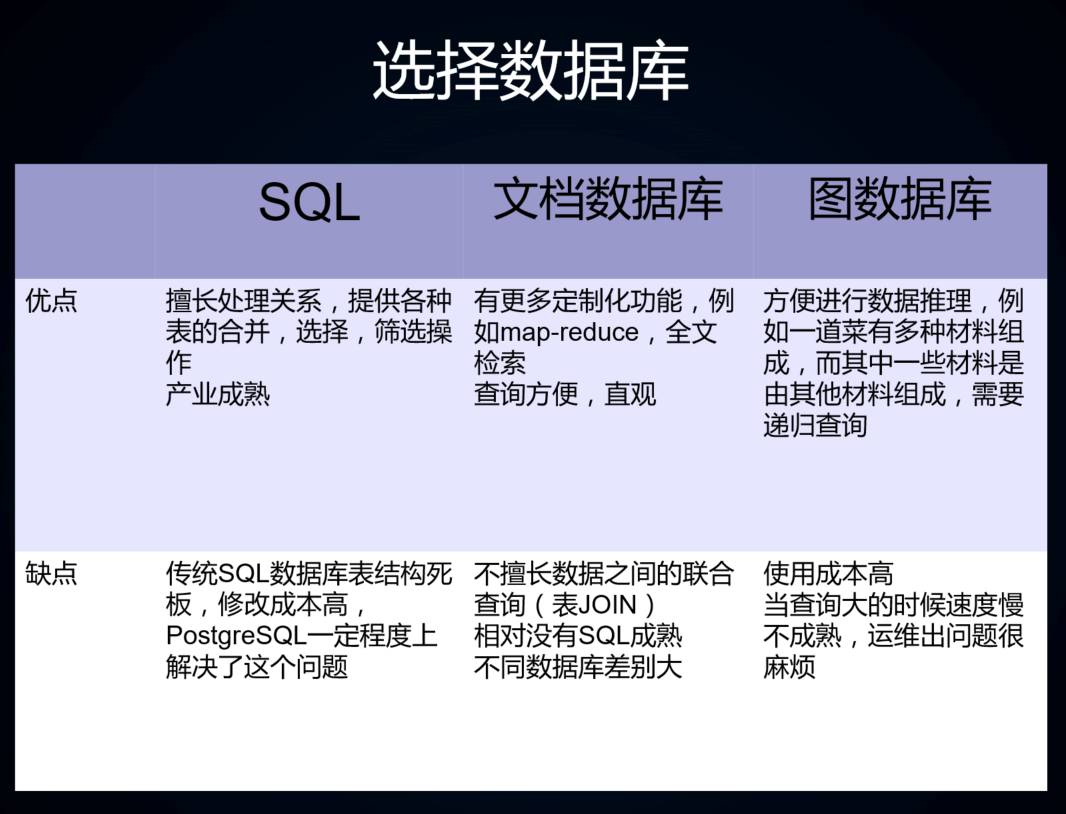 最后一个是图数据库,在座几位老师也都提到过。优点就是在这三种数据库里面,它的表达力是最强的,为此付出的代价就是性能。目前的图数据库的性能都比较差,量稍微大一点以后都不行,而且图数据库还有一个非常本质的限制,就是它的分布式查询能力比较差,所以如果数据量比较大,图数据库就不是好的选择。