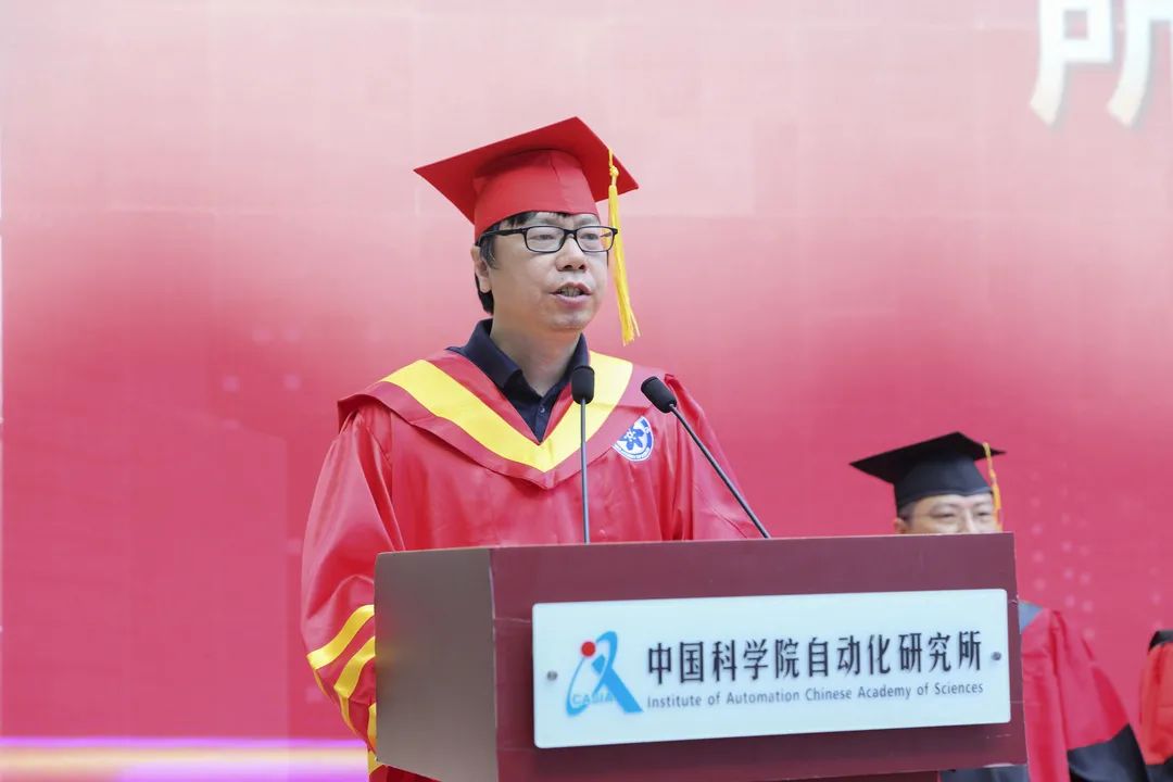 导师代表王飞跃研究员饱含深情地寄语毕业生“坚持、智能、简单,做时代的光明使者”。他强调“坚持才有希望,不是有了希望才坚持”,“我坚信,你们有更多更好的方式把复杂变智能变简单,更加有效,不是内卷,是让大家不要太累,让百姓过上更好的日子,让国家和民族更加富强”。最后他叮嘱毕业生要做好时间规划,少熬夜,争做“睡好觉、吃好饭、健好身”的三好学生。