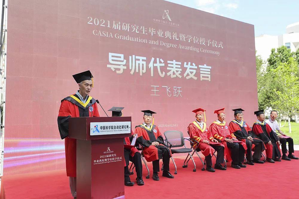 6月20日上午,自动化所2021届研究生毕业典礼暨学位授予仪式在智能化大厦北广场隆重举行。自动化所所长徐波、副所长刘成林、所学位委员会主席谭民、导师代表王飞跃研究员、徐德研究员、杨戈研究员、余山研究员及全体毕业生出席典礼,参加典礼的还有2020届校友代表及部分毕业生亲属。仪式由陶建华研究员主持。