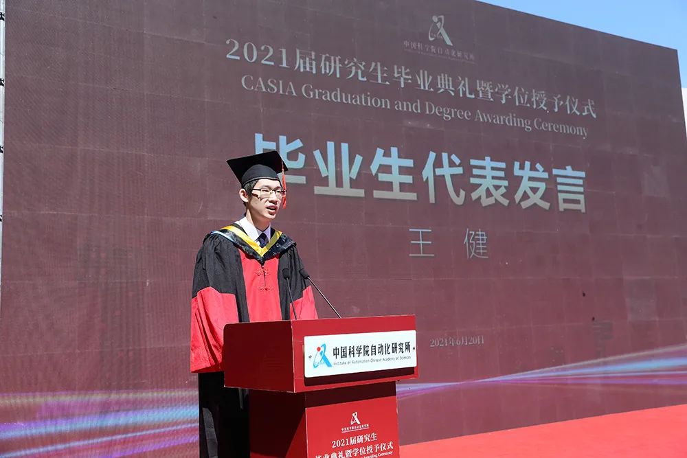 毕业生代表、复杂系统管理与控制国家重点实验室2016级博士生王健代表毕业生感谢自动化所为同学们提供的良好科研创新环境,他回顾了自己在研究所的学习、生活经历,表达了对研究所和导师的感恩之情,毕业后他选择留所继续从事科研工作。他最后总结道,作为自动化所的毕业生,要带着自强不息、实事求是的精神和态度,用自己的学识为国家、为党和人民贡献力量!
