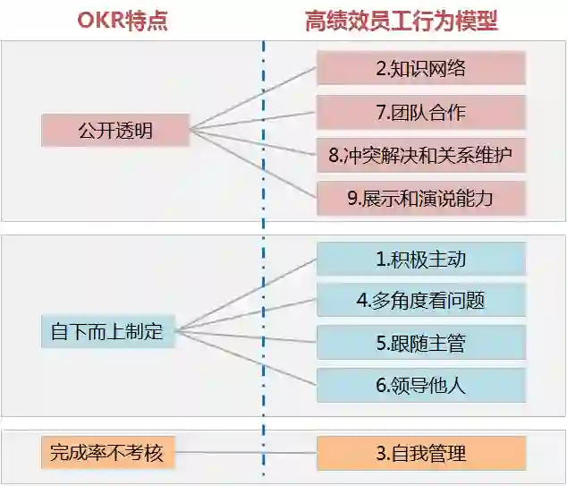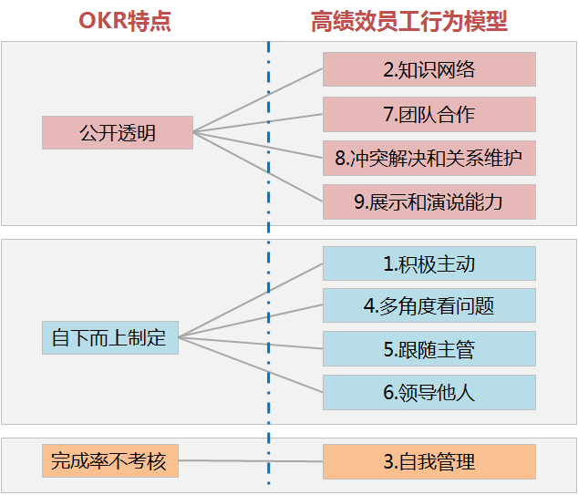 如果再仔细分析一下这三个特点和高绩效员工的行为模型,就会发现,OKR几乎就是为高绩效员工量身打造了一个更加适配的环境,更便于培育员工的高绩效行为模型了。