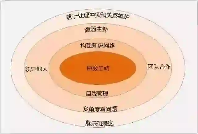 越靠近圆心的行为模式越重要:比如要想成为一个高绩效员工,积极主动做事无疑比展示和表达更为重要。