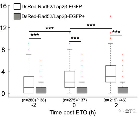 Rad52蛋白也和Ku80蛋白一样,DsRed-Rad52病灶的数量在白天很低,在夜间增加了约2倍: