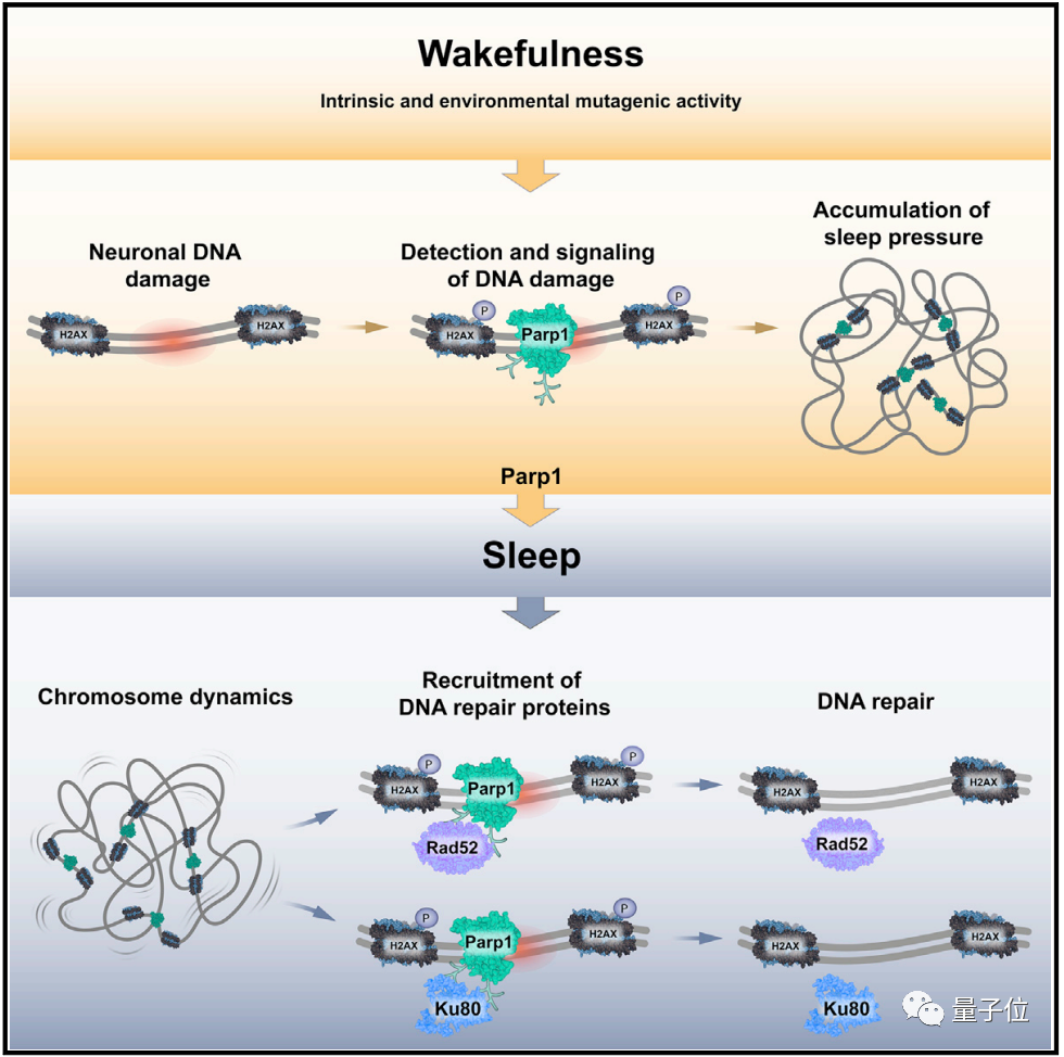 当神经元中的DNA发生损伤时,PARP1蛋白是损伤修复系统中反应最快的蛋白之一,它能生物清醒时就到达损伤的位置进行标记,同时还会让大脑发出催促生物睡觉的指示。