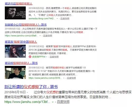 到百度去搜索关键词“毁掉的年轻人”,可以看到,他们有的毁于“花呗”、有的毁于“混日子”、有的毁于“仪式感”...