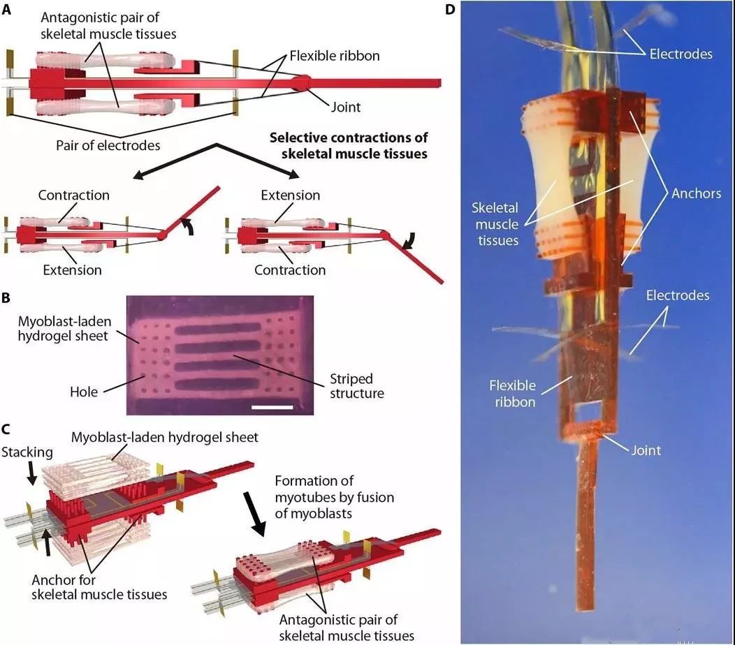 拥有这种“骨骼肌肉组织”的“生物合成机器人”是生物机器人领域的一个新突破,不仅因为它使用了功能齐全的骨骼肌肉组织,还因为它比以往利用独立肌肉组织进行收缩运动的构造更为耐久,克服了独立肌肉组织容易僵硬的缺点,关节部位的活动范围也更大!