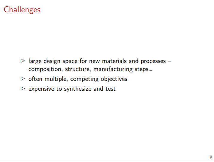 先进的材料和制造方法是当今社会经济发展的重要驱动力,这一领域通过廉价的批量生产,使得现代社会工业发展达到前所未有的规模,令电视和计算机等消费设备在我们的日常生活中无处不在。在高性能环境中普遍需要新型材料,例如用于计算机和蜂窝技术的光电器件、光伏和消费电子产品,以及空间和航空应用等极端环境中的特种材料等。然而,设计新材料是一个缓慢而费力的过程,需要大量的资本和劳动力。材料的合成、开发和表征都是一个耗时且昂贵的过程;尤其是大量不同的替代品必须经过评估和优化才能进入市场。通常,这一领域中理论模型的指导作用很小,对新材料需要在小规模范围内进行大量的测试,已达到全面的了解。