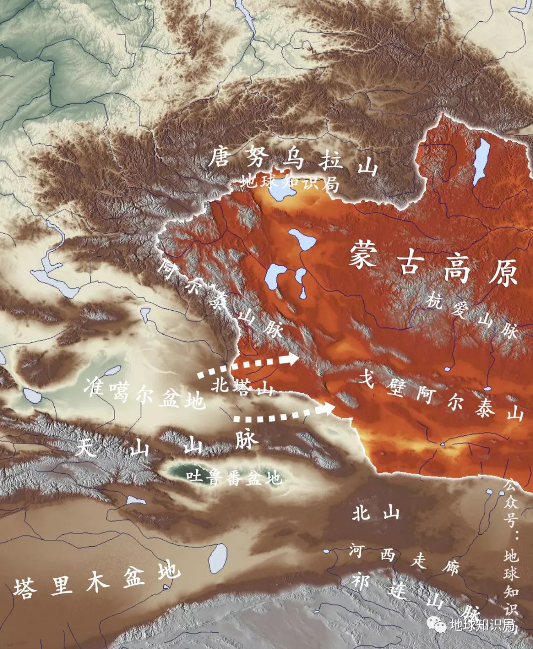 在新疆的东侧,山地相对平行分布,与蒙古高原和河西走廊有着一定的交通通达条件。其中延伸至蒙古高原东缘的阿尔泰山,不仅为准噶尔盆地带来开放的东南角,还为新疆自然而然的开辟了两条东去蒙古高原的路途:阿尔泰山与北塔山间布尔根河通道,和北塔山与天山间的戈壁通道。