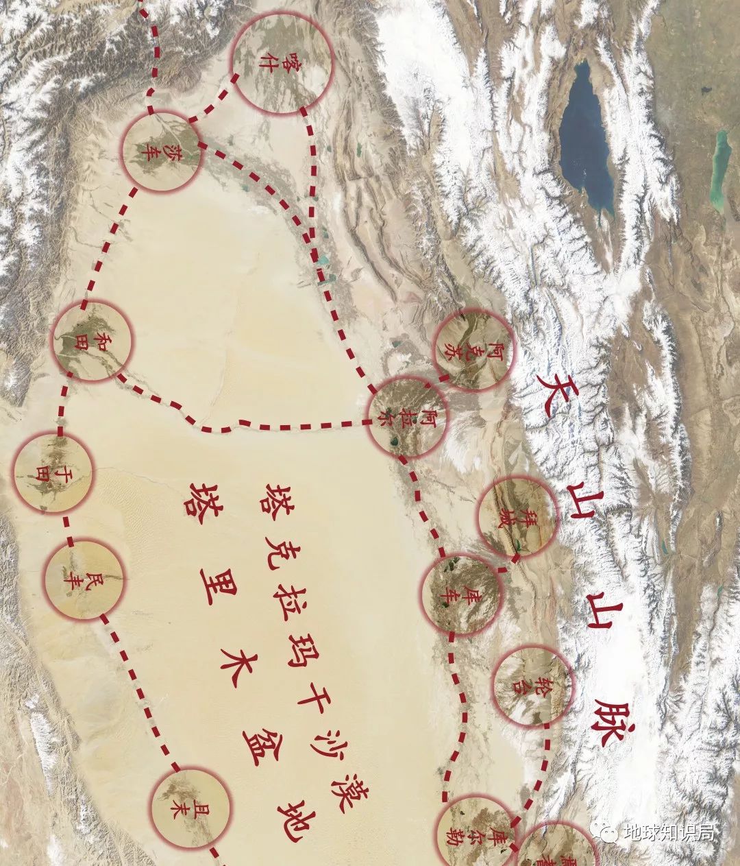 由于天山和昆仑山山麓地区和冲积扇有着可观的水源用于农业生产,因此在塔里木盆地的边缘分布着连片成带的绿洲。这些绿洲带构建出了新疆地区最早的交通通道:一个个绿洲定居点仿佛一座座驿站,使重重山围的内陆荒原有了成为通衢的机遇,也让新疆与周边的文明产生多元的互动。