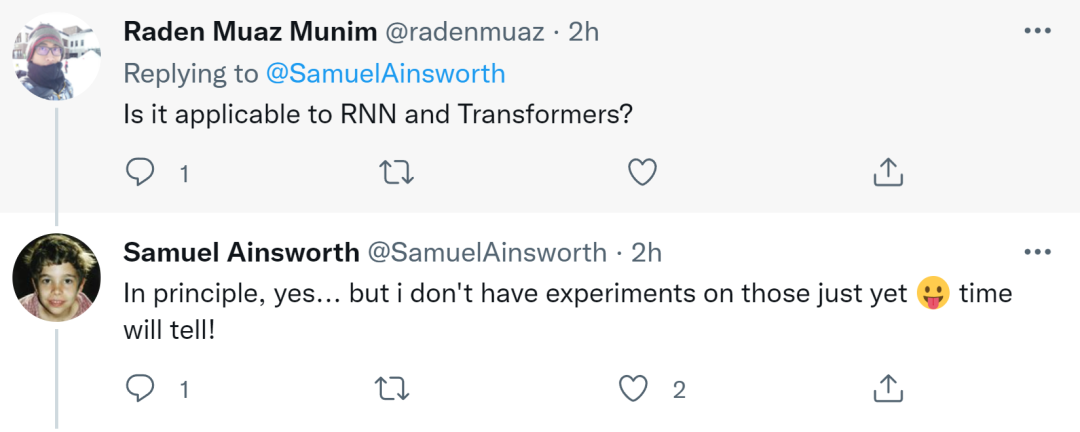 还有人问是否适用于 RNN 和 Transformers?Ainsworth 表示原则上适用,但他还没有对此进行实验。时间会证明一切。