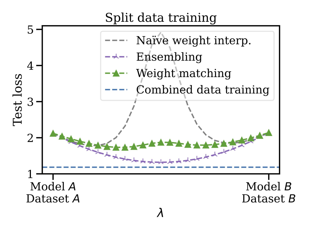 这种合并方法还有其他优点,你可以在不相交和有偏差的数据集上训练模型,然后在权值空间中将它们合并在一起。例如,你有一些数据在美国,一些在欧盟。由于某些原因,不能混合数据。你可以先训练单独的模型,然后合并权重,最后泛化到合并的数据集。