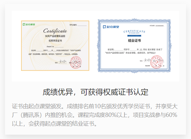 课程完成度80%以上,项目实战参与60%以上,会获得起点课堂的结业证书。