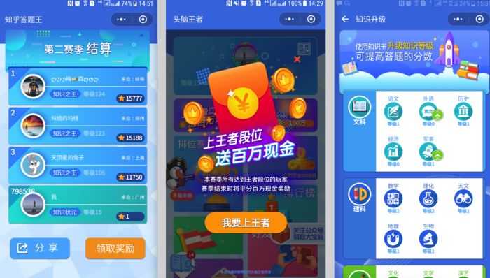 在这近一个月的交战时间里,直播答题的奖池金额越来越高,场次越来越多,更多的玩家加入了战局。视频直播,所有用户在同一时间进行答题,10秒作答时间,答对12题即可平分奖金的游戏规则,令用户时间被一场场二十几分钟的答题所切割占据, 全民答题狂欢持续上演…同时通过答错淘汰使用复活卡的玩法刺激分享裂变。