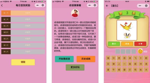 这一时代的产品有两种代表类型,第一种是以《成语猜猜看》为典型代表的答题类产品。经典的玩法是:界面很很简单,玩法是从13年最火的《疯狂猜歌》、《疯狂猜图》那样的玩法直接复制过来的。可以答题的东西有:猜成语、猜歇后语、猜歌、猜诗词、猜明星。当你闯关的时候可以加金币,分享也能加金币,金币可以用来提示正确的答案帮助通过。