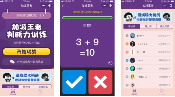 第二种是以《加减王者》等为代表的答题类产品。典型的套路:答对12道题,就可以获得娃娃奖励或者现金奖励。本质则是通过极小的成本物质奖励获取大量的的流量然后将流量导给公众号。