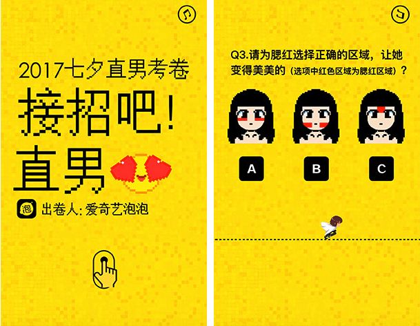 举个例子:2017年的七夕节,一个叫《七夕考卷》的现象级H5迅速刷爆了朋友圈。截至七夕当天,PV2646.6万,分享成功次数137.8万。通过答题的机制对男女之间思考问题角度不一样进行调侃。