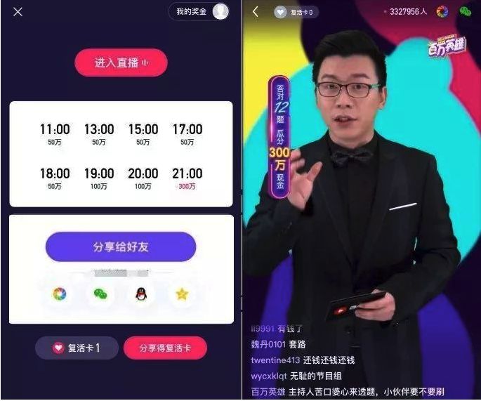 从产品层面与用户体验来说:如果抛开了现金的角度,它们本身并没有特别好玩。特别是有一个主持人在上面尬聊其本身又没有很好的控场功底的话,每一道题目的过渡都是一个答题流程的打断。这也就是为什么它不能一直火下去的原因。当时匆匆忙忙加入这个功能的APP现在又悄悄摸摸的把这个功能去掉了。