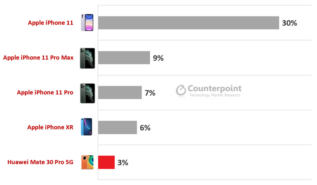 Mate 30 系列也见证了华为的巅峰,60 天销量破 700 万部,三个月销量破 1200 万部。2020 年第一季度全球高端智能手机销量前五的型号中,华为 Mate 30 Pro 5G 挤进第五,是前五中唯一的非苹果手机。